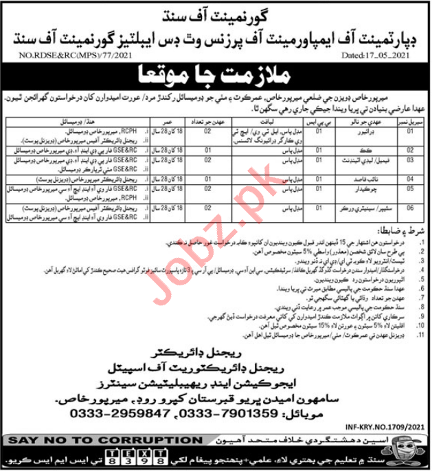 Special Education & Rehabilitation Centers Mirpur Khas, Department of Empowerment of Persons with Disabilities, Government of the Sindh require services for Driver, LTV Driver, HTV Driver, Cook, Female Attendant, Lady Attendant, Naib Qasid, Chowkidar, Sweeper, Sanitary Worker.