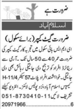 EMS High School H-11 Islamabad, islamabad Islamabad Pakistan invites applications from eligible candidates for the post of gate keeper as per advertisement of May 24, 2025 published in daily Express Newspaper. Preferred Education is Matric and Middle etc.
