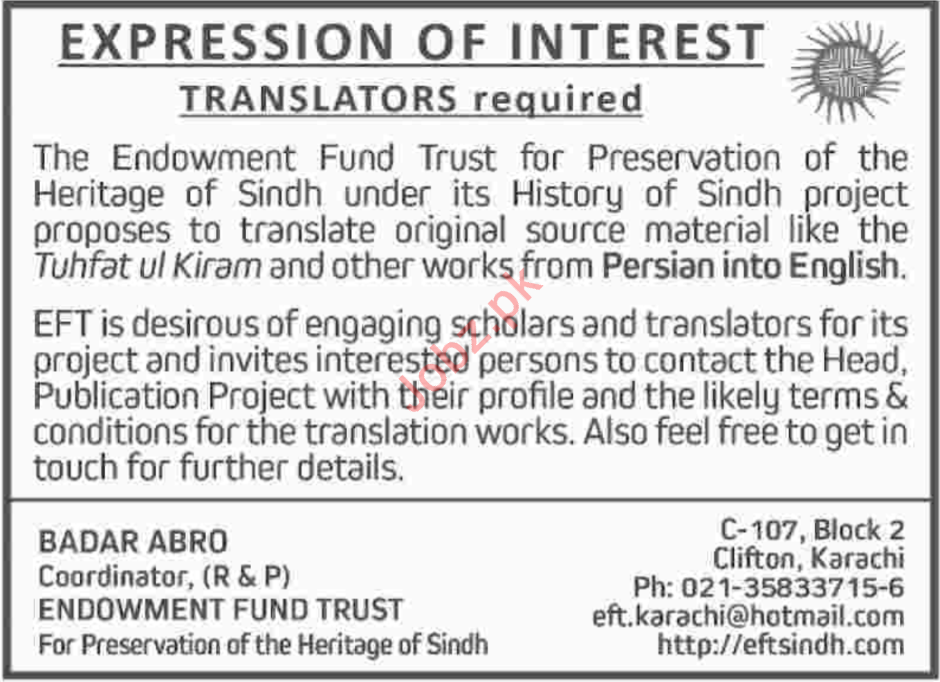 Endowment Fund Trust EFT Karachi Jobs 2018 Translators