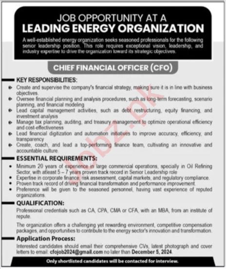 Energy Company Karachi, karachi Sindh Pakistan invites applications from eligible candidates for the post of chief financial officer cfo as per advertisement of November 24, 2024 published in daily Jang Newspaper. Bachelor, CA, MS and Master etc. educational qualification will be preferred.