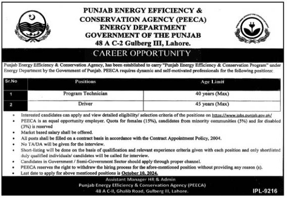 Energy Department Lahore, lahore Punjab Pakistan invites applications from eligible candidates for the post of program technician and driver as per advertisement of October 1, 2024 published in daily Nation Newspaper. Intermediate, Middle, Bachelor and Matric etc. educational qualification will be preferred.