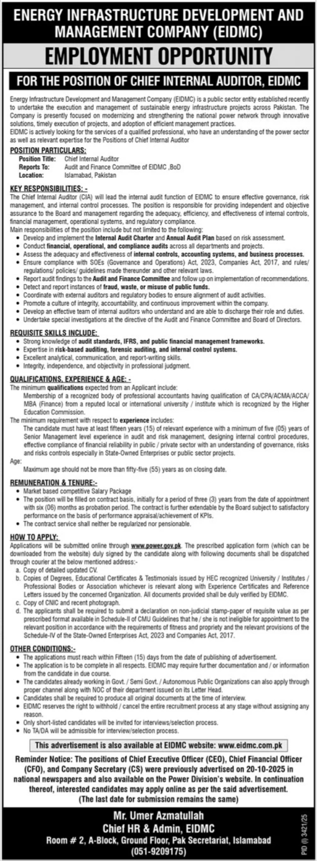 Energy Infrastructure Development & Management Company EIDMC invites applications for job positions advertised in daily Jang dated 26 October 2025 for following vacancies in Islamabad, islamabad Islamabad Pakistan.