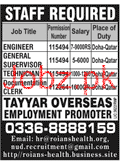 Engineer, General Supervisor, Clerk Job in Tayyar Overseas