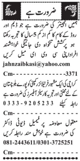 Private Company Quetta, quetta Balochistan Pakistan invites applications from eligible candidates for the post of construction engineer, doctor, engineer, female doctor, duty doctor and sales officer as per advertisement of April 8, 2022 published in daily Jang Newspaper. Preferred Education is Matric, MBBS, Bachelor and Intermediate etc.
