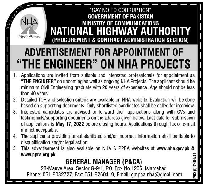 Apply at National Highway Authority NHA latest Government jobs in Engineering and departments before closing date which is around May 17, 2022 or as per closing date in newspaper ad. Read complete ad online to know how to apply on latest National Highway Authority NHA job opportunities.
