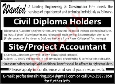 Engineering & Construction Firm invites applications for job positions advertised in daily Jang dated 22 October 2023 for following vacancies in Lahore, lahore Punjab Pakistan.