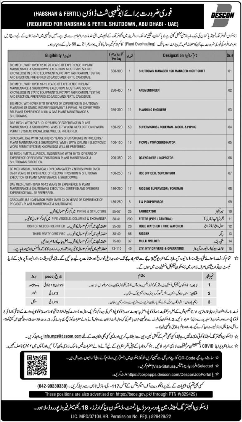 Descon Engineering Limited invites applications for job positions advertised in daily Jang dated 19 June 2022 for following vacancies in Abu Dhabi, abu dhabi UAE.
