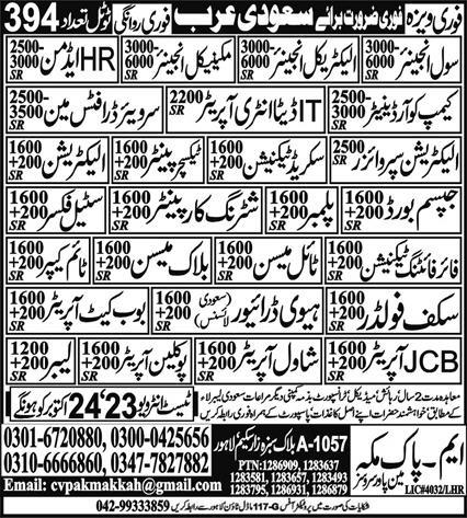 Vacant posts including surveyor, tile mason, shawal operator, time keeper, jcb operator, poclane operator, electrician, electrical engineer, texture painter, labor, bobcat operator, steel fixer, draftsman, electrician supervisor, plumber, data entry opperator, gypsum board, sacred techniain, scaffolder, it data entry operator, heavy driver, civil engineer, camp coordinator, mechanical engineer, fire fighting technician, hr admin, block mason and shuttering carpenter are announced in M Pak Makkah Manpower Services Saudi Arabia, saudi arabia Saudi Arabia as per 19 October 2022 advertisement in daily Express Newspaper. Preferred Education is Matric, Bachelor, Middle and Intermediate etc.