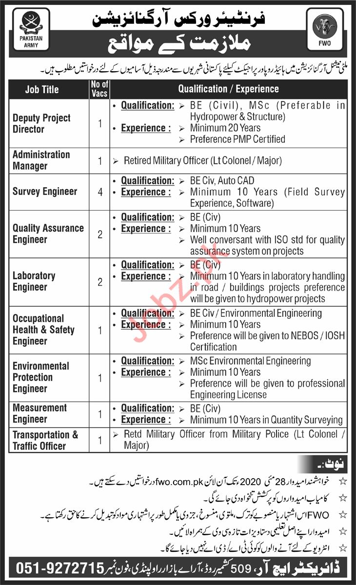 Quality Assurance Engineer, QA Engineer, Laboratory Engineer, Occupational Engineer, Safety Engineer, Environmental Protection Engineer, Measurement Engineer, Transportation Officer, Traffic Officer, Deputy Project Director, Administration Manager, Engineer, Survey Engineer seeks in Frontier Works Organization FWO Rawalpindi.