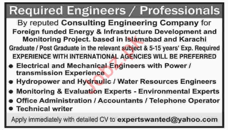 A well reputed Consulting Engineering based in Karachi seeks candidates for the posts of Engineer, Electrical Engineer, Mechanical Engineer, Power Transmission Engineer, Water Resources Engineer, Monitoring Expert, Evaluation Expert, Office Administrator, Accountant, Telephone Operator, Technical Writer.