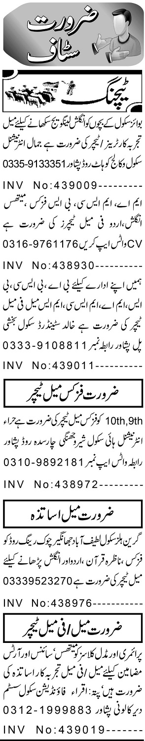 Private School Peshawar, peshawar Khyber Pakhtunkhwa KPK Pakistan invites applications from eligible candidates for the post of teacher, primary teacher, nazra teacher, arts teacher, physics teacher, quran teacher, female teacher, trainer, science teacher, english teacher, urdu teacher, mathematics teacher and english language teacher as per advertisement of February 14, 2025 published in daily Aaj Newspaper. MA, BA, Master, M.sc, B.ed and Bachelor etc. educational qualification will be preferred.