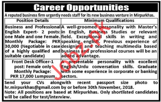 English Expert & Front Desk Officer Jobs 2018 In Mirpurkhas