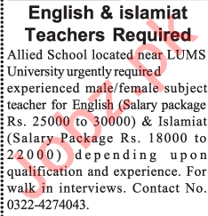 English & Islamiat Teacher Jobs 2018 In Lahore