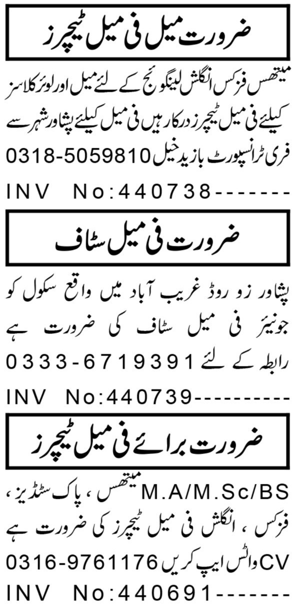 Vacant posts including teacher, english teacher, english language teacher, maths teacher, lady teacher, pak studies teacher and physics teacher are announced in Private School Dalazak Road Peshawar, peshawar Khyber Pakhtunkhwa KPK Pakistan as per 19 April 2025 advertisement in daily Aaj Newspaper. Preferred Education is Bachelor, MA, Master and M.sc etc.