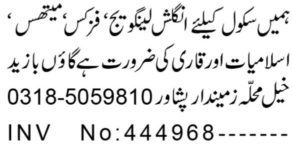 Private School is looking for candidates for following posts as per job advertisement published in daily Aaj Newspaper of September 11, 2025 for location Peshawar, peshawar Khyber Pakhtunkhwa KPK Pakistan: