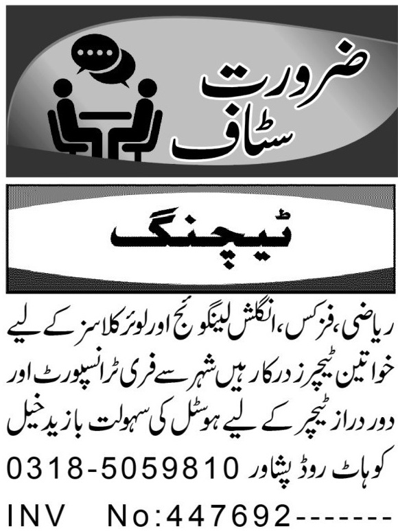 Private School invites applications for job positions advertised in daily Aaj dated 5 December 2025 for following vacancies in Kohat Road Peshawar, peshawar Khyber Pakhtunkhwa KPK Pakistan.