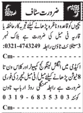 English Language Teacher & Qaria Jobs 2022 In Quetta