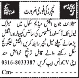Private School Quetta, quetta Balochistan Pakistan invites applications from eligible candidates for the post of english language teacher, teacher, lady teacher, english teacher, science teacher and computer teacher as per advertisement of September 28, 2022 published in daily Jang Newspaper. Master, Intermediate and Bachelor etc. educational qualification will be preferred.