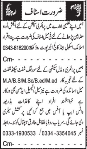 Private School jobs advertisement dated about 14 August 2025 in daily Jang Newspaper invites application for the vacant post of teacher, female teacher, urdu teacher, english teacher, admin officer and primary teacher in Quetta, quetta Balochistan Pakistan. Educational qualifications required M.ed, Master, BA, M.sc, Others, MA, B.ed and Bachelor etc.