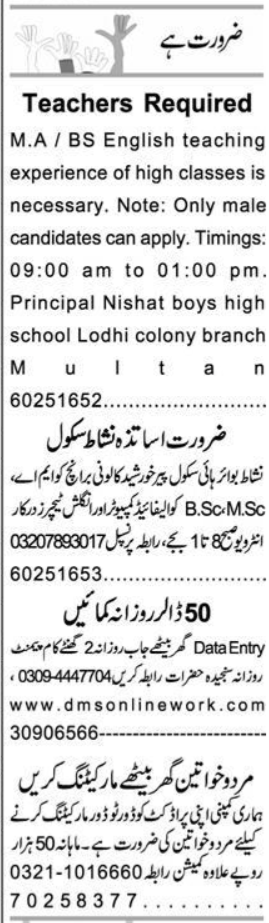 English Teacher & Computer Teacher Jobs 2025 in Multan