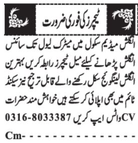 Private School Quetta, quetta Balochistan Pakistan invites applications from eligible candidates for the post of english language teacher, english teacher, teacher and female teacher as per advertisement of June 7, 2022 published in daily Jang Newspaper. Candidates with Master and Bachelor etc. educational background will be preferred.