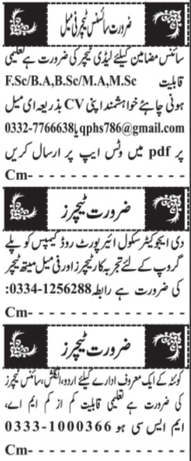 Private School Quetta, quetta Balochistan Pakistan invites applications from eligible candidates for the post of mathematics teacher, lady teacher, science teacher, teacher, urdu teacher and english teacher as per advertisement of March 16, 2022 published in daily Jang Newspaper. Persons with Intermediate, Master and Bachelor etc. education can apply.