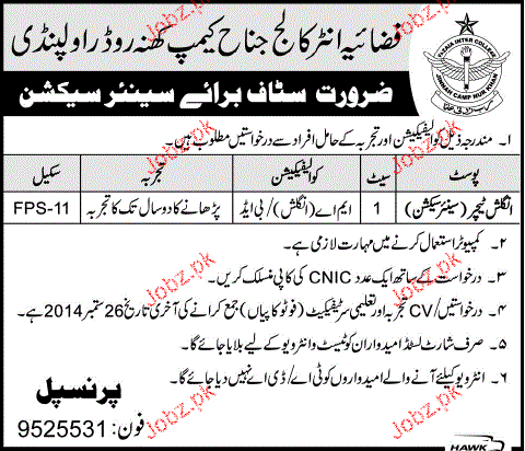 English Teachers are required in Fazaia Inter College Jinnah Camp in Rawalpindi