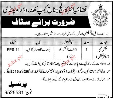 English Teachers Job In Fazaia Inter College Jinnah Camp