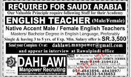 Assalamualaikum! I am willing to work in Saudi Arabi as English Language Teacher, I have have been teaching English Language for four years in Karachi's collegiates. I will prove to be honest, sincere and punctual provided I am given a chance to work under kind supervision. I have passed my graduation form the University of Karachi.