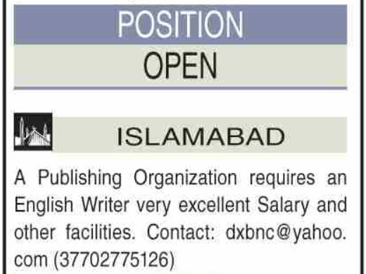 Publishing Organization Islamabad, islamabad Islamabad Pakistan invites applications from eligible candidates for the post of english writer as per advertisement of December 16, 2022 published in daily Dawn Newspaper. Preferred Education is Master and Bachelor etc.