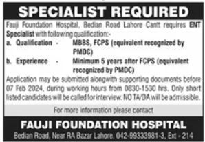 Fauji Foundation Hospital jobs advertisement dated about 30 January 2024 in daily Dunya Newspaper invites application for the vacant post of ent specialist in Lahore, lahore Punjab Pakistan. Educational qualifications required MBBS, Others and P.G Diploma etc.
