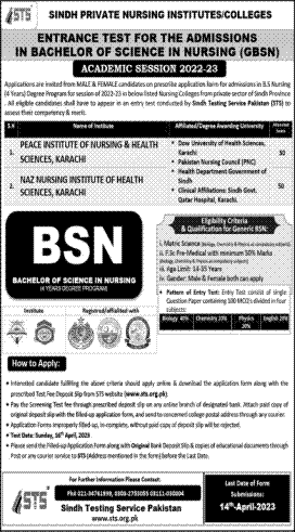 Nursing Institute Bachelor of Nursing BSN admissions 2023 has been started. Students who want to take admissions in Nursing Institute Karachi Sindh Pakistan for academic year 2023 to continue education in Medical College can apply. Students who want to enroll for academic session 2023 in BSN qualification and admission criteria for Private institute can apply till last date 14 April 2023. Read newspaper ad for exact details.