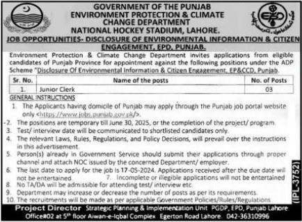 Vacant posts including clerk are announced in Environment Protection & Climate Change Department Lahore, lahore Punjab Pakistan as per 2 May 2024 advertisement in daily Nawaiwaqt Newspaper. Educational qualifications required Intermediate etc.
