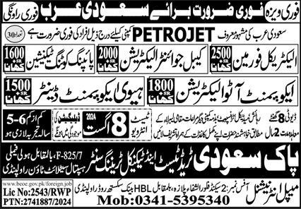 Apply at Pak Saudi Trade Test & Technical Training Center latest Overseas jobs in Manufacturing and departments before closing date which is around August 8, 2024 or as per closing date in newspaper ad. Read complete ad online to know how to apply on latest Pak Saudi Trade Test & Technical Training Center job opportunities. Piping, Electricians and Automotive skills may beneficial for these Pak Saudi Trade Test & Technical Training Center jobs. Salary varies from 186000. Earn more by overtime. Free transport, accommodation, food and medical may be available.