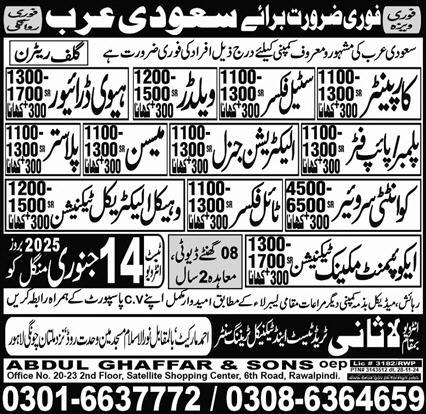 Lasani Trade Test & Technical Training Center Dammam, riyadh Saudi Arabia invites applications from eligible candidates for the post of heavy driver, plaster, steel fixer, quantity surveyor, pipe fitter, welder, equipment mechanic technician, driver, mason, vehicle electrical technician, tile fixer, carpenter, htv driver, plumber and electrical general as per advertisement of January 9, 2025 published in daily Express Newspaper. Persons with Bachelor, Matric, DAE and Intermediate etc. education can apply.