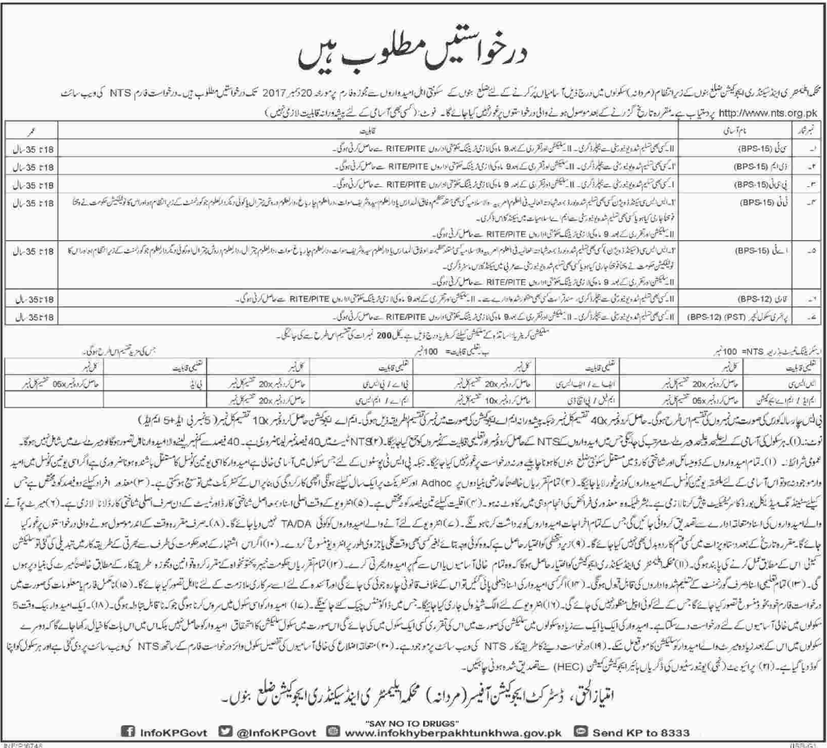 Qualified and well educated candidates for the posts of teachers and qari wanted for Elementary and Secondary Education Department ESED in District Bannu, KPK Via National Testing Services NTS. The interested candidates apply as per given criteria.