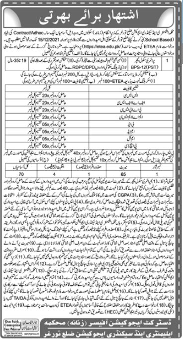 ESED Torghar KPK Primary Teacher Jobs Via ETEA