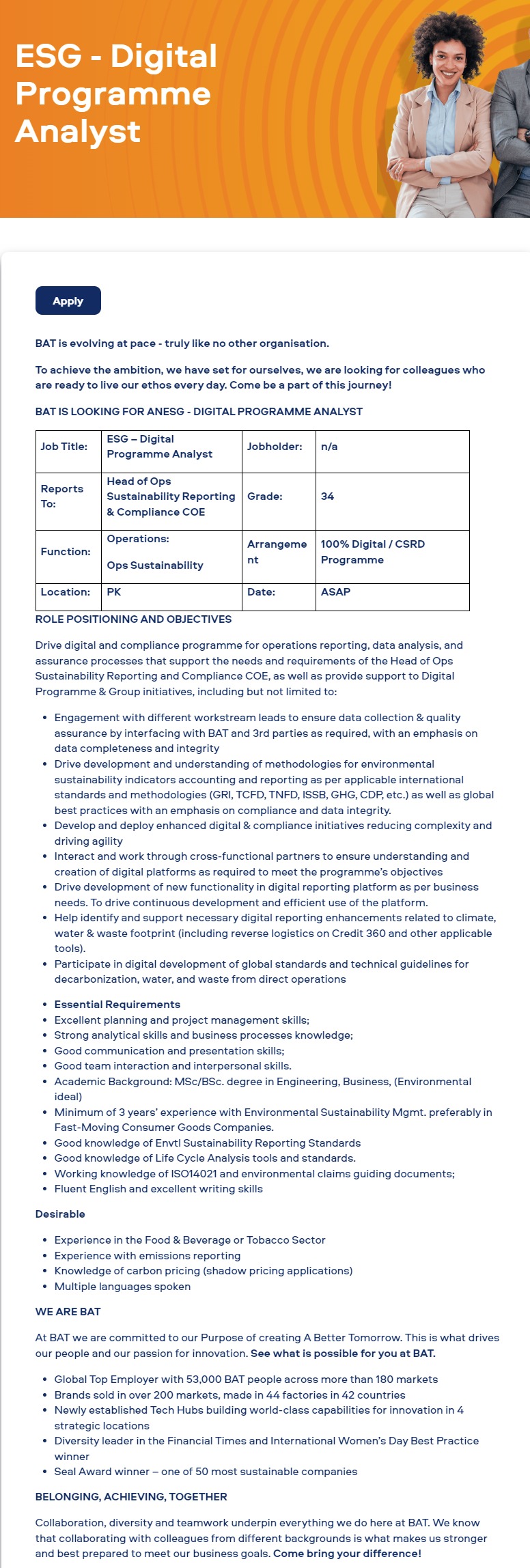 Original Source: https://careers.bat.com/job/lahore/esg-digital-programme-analyst/27325/7953004096
