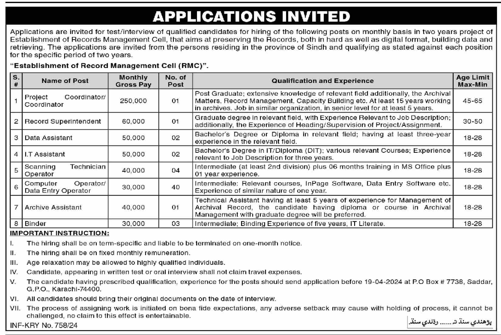 Establishment of Record Management Cell RMC Sindh Jobs 2024