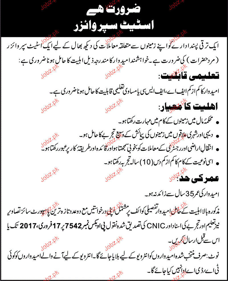 Apply as per details in job advertisement. Login to view further details of how to apply via https://www.jobz.pk online.