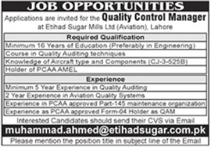 Etihad Sugar Mills Limited Mall Road Lahore, lahore Punjab Pakistan invites applications from eligible candidates for the post of qc manager and quality control manager as per advertisement of March 29, 2025 published in daily Jang Newspaper. Persons with DAE and Master etc. education can apply.
