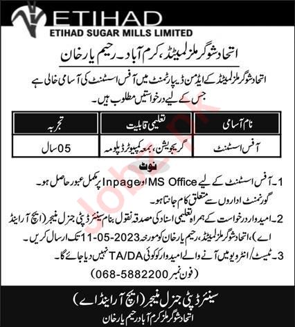 Etihad Sugar Mills Limited jobs advertisement dated about 7 May 2023 in daily Express Newspaper invites application for the vacant post of office assistant in Rahim Yar Khan, rahim yar khan Punjab Pakistan. Educational qualifications required Bachelor etc.
