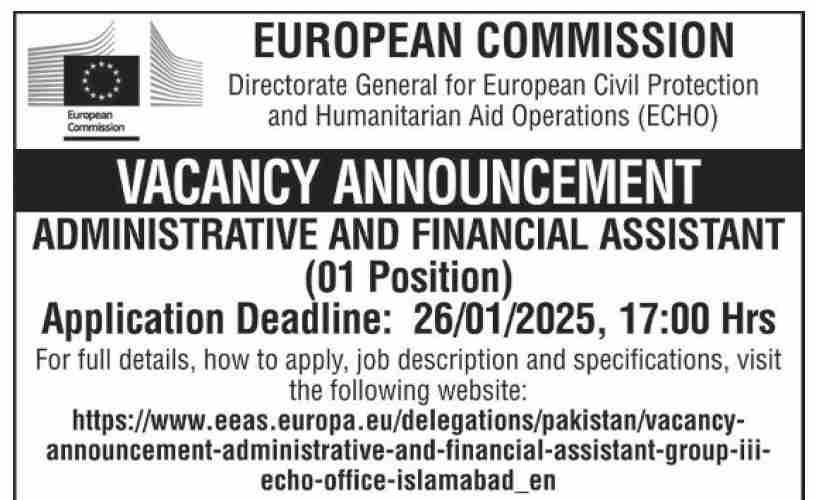 European Commission Islamabad, islamabad Islamabad Pakistan invites applications from eligible candidates for the post of administrative assistant and financial assistant as per advertisement of January 14, 2025 published in daily Dawn Newspaper. Educational qualifications required MS, Bachelor and Master etc.