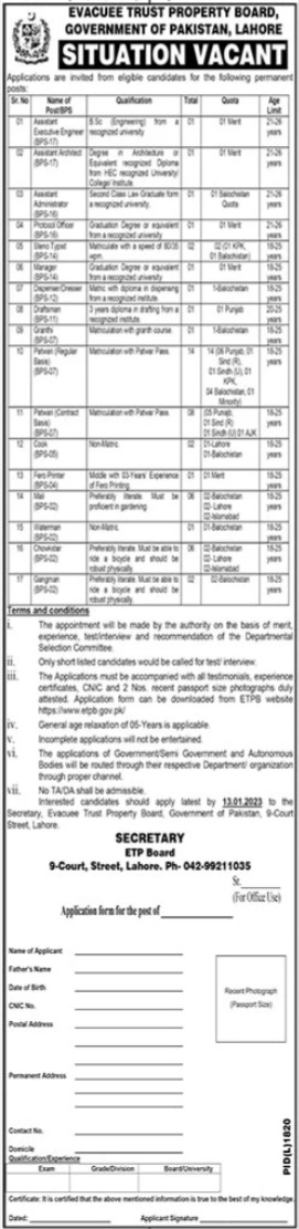 Evacuee Trust Property Board invites applications for job positions advertised in daily Jang dated 21 December 2022 for following vacancies in Lahore, lahore Punjab Pakistan.