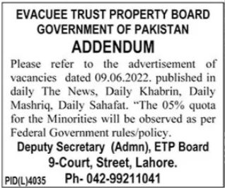 Evacuee Trust Property Board latest Government Management jobs and others can be applied till 30 June 2022 or as per closing date in newspaper ad. Read complete ad online to know how to apply on latest Evacuee Trust Property Board job opportunities.