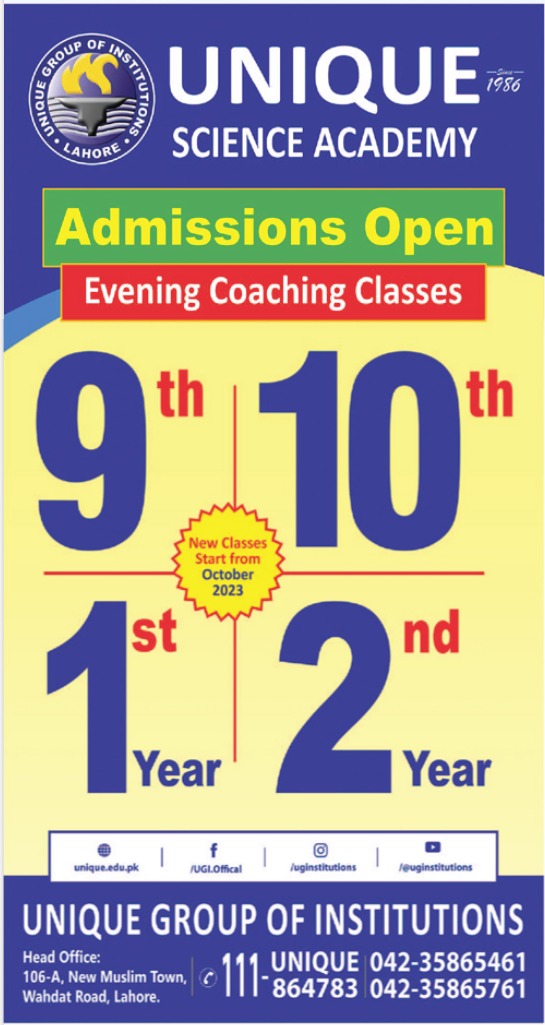 Admissions in Unique Science Academy 2023 for 9th Class, 10th Class, 1st Year, 2nd Year has been announced. Students can enroll for admissions in Unique Science Academy Lahore Punjab Pakistan for academic year 2023 to continue campus based or online education in Science College. Students for admissions in Matric and Intermediate can apply for online or campus classes as per Private institute criteria till admission closing date November 1, 2023. Read newspaper ad for exact details.