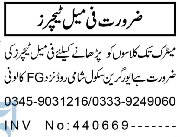 Evergreen School Shami Road FG Colony Peshawar Jobs 2025