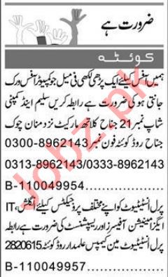Examination Officer, Female Computer Operator, Civil Supervisor, Architect, Writer, Office Assistant, Teacher, English Teacher, Chemistry Teacher, Physics Teacher, Coordinator, QC Analyst, QA Analyst, Promotion Officer, Assistant Supervisor, Outdoor Delivery Staff, Security Guard, Driver seeks in well reputed companies.