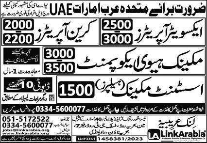 Link Arabia Overseas Recruitment Company jobs advertisement dated about 14 March 2023 in daily Express Newspaper invites application for the vacant post of excavator operator, helper, crane operator, mechanic heavy equipment and assistant mechanic in Abu Dhabi, abu dhabi UAE. Preferred Education is Matric, Middle and Intermediate etc.