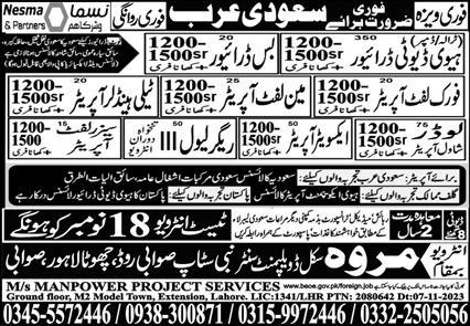 Vacant posts including main lift operator, htv driver, driver, excavator operator, fork lift operator, bus driver, rigger, shawl operator, loader, heavy duty driver and tele handler operator are announced in Marwa Skill Development Center Riyadh, dammam Saudi Arabia as per 17 November 2023 advertisement in daily Express Newspaper. Candidates with Matric and Intermediate etc. educational background will be preferred.